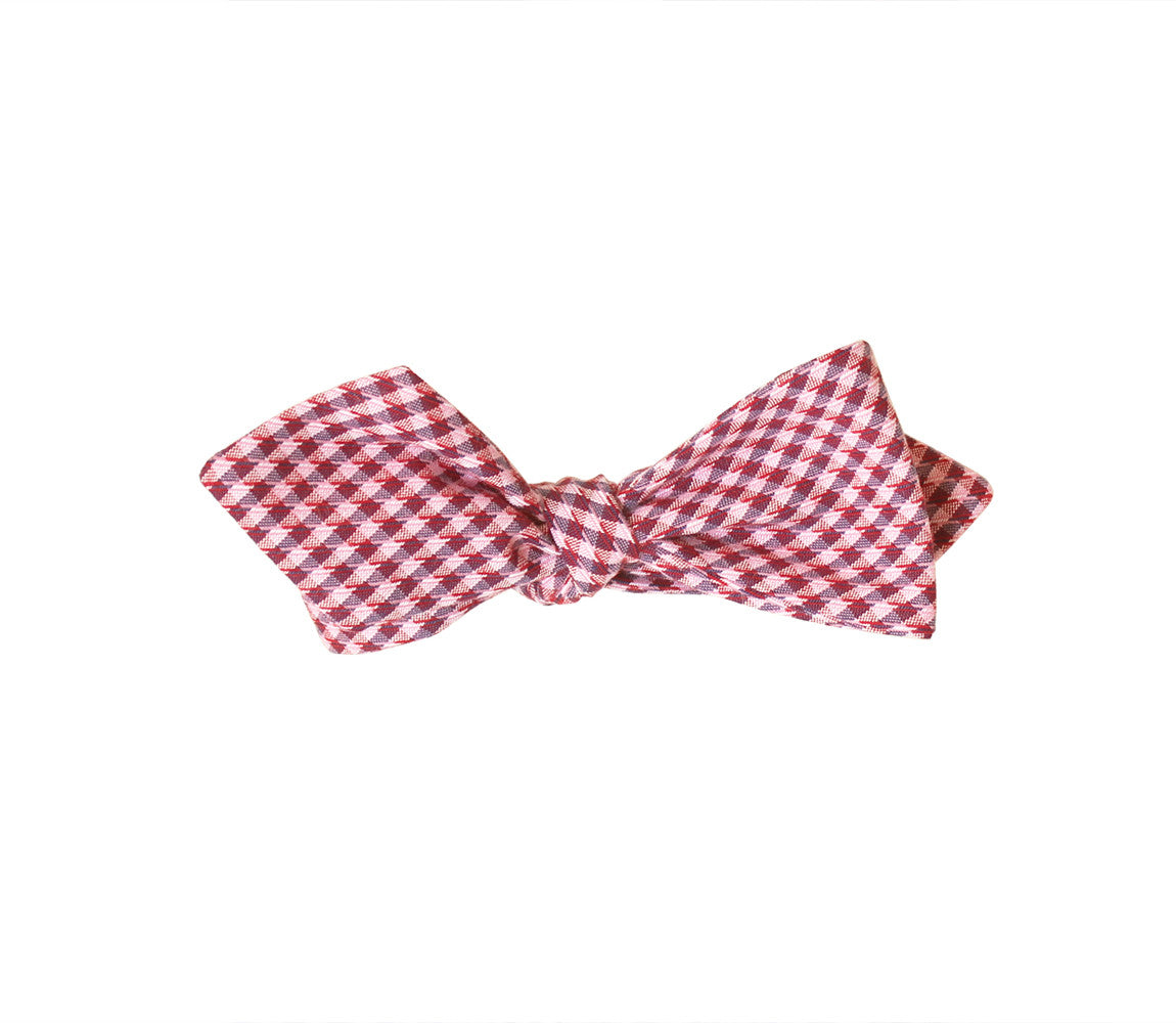 Red cotton daimond tip bow tie with gingham pattern, handmade in New York City. This is a self tie, adjustable bow tie.